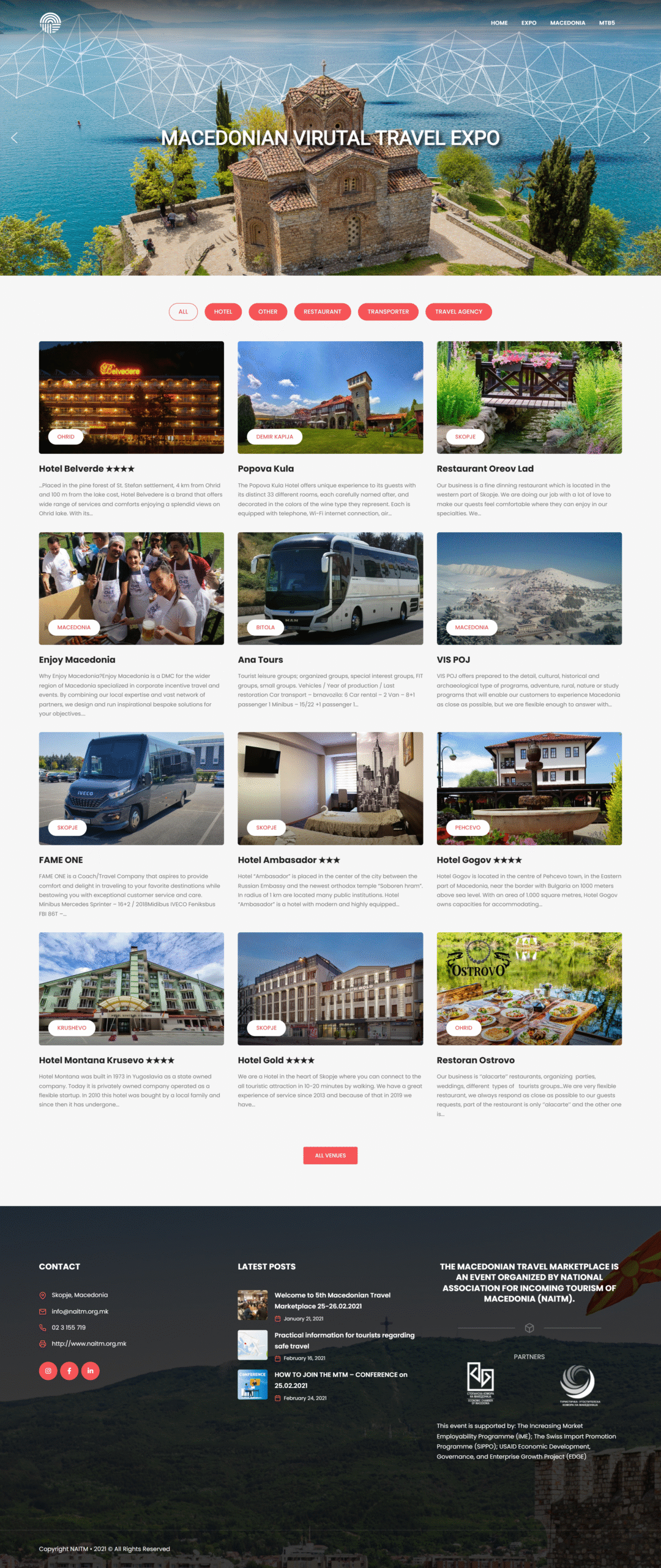 The Macedonian Virtual Travel Expo is a fully custom web platform showcasing North Macedonia’s tourism offerings in an immersive, online expo format. Administrators manage exhibitors—hotels, restaurants, transporters, and agencies—via a secure back-end CMS that supports image galleries, detailed descriptions, and categorization by region and sector. Visitors can browse an interactive, filterable grid of participants, view individual profiles with high-resolution photos and rich text, and toggle between English and Macedonian. A registration portal allows industry professionals to sign in for networking, virtual booth access, and downloadable brochures. Responsive design ensures a seamless experience on desktop, tablet, and mobile, enabling domestic and international audiences to explore Macedonian destinations anytime, anywhere.
